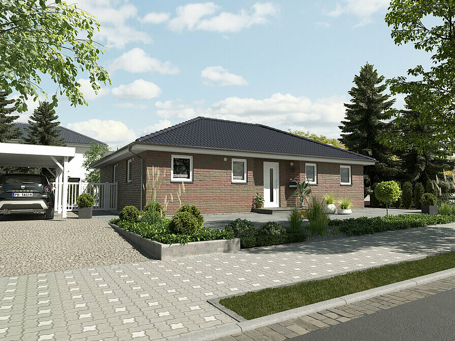 Der Bungalow 110 bietet auf einer Ebene viel Platz für die ganze Familie – mit hellem Wohnbereich, 3 Schlafzimmern und direktem Gartenzugang. Das Walmdach verleiht Charakter. Jetzt anfragen und stufenlos wohnen!